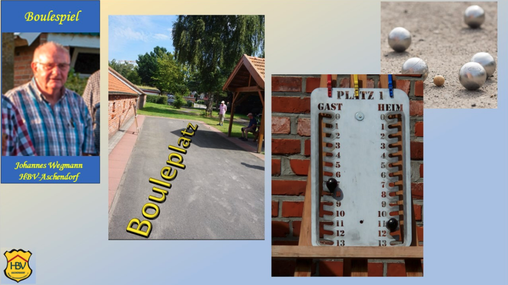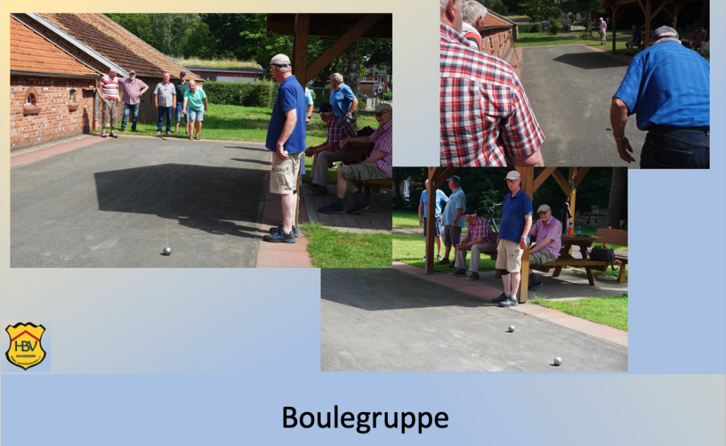 In 2019 hat der HBV auf dem Heimathofgelände eine Boulebahn erstellt. Die Bouleanlage entspricht dem internationalem Standard von 4 x 16 m. Der doch etwas spezielle Schichtenaufbau der wassergebundenen Decke aus Schotter und Splitt verschiedener Korngrößen wurde sorgfältig und in Eigenarbeit des Vereins ausgeführt. Ein Unterstand vervollständigt die Anlage. Die Bouleanlage befindet sich in der Obhut des HBV. Aus versicherungs- rechtlichen Gründen ist eine regelmäßige Nutzung durch Vereinsmitglieder vorgesehen. Die Anlage ist öffentlich zugänglich, Spielmaterial wird vom HBV gestellt und der Freizeitspaß in geselligen Runden überwiegt den geringen Jahresvereinsbeitrag (aktuell: 14,- EUR Einzelbeitrag bzw. 20,- EUR für Ehepaare) bei Weitem.